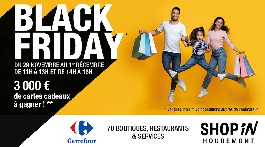 Pour célébrer le Black Friday dans une ambiance festive, le centre commercial Shop'in Houdemont propose aussi un jeu concours dans les allées avec des animations de 11h à 13h et de 14h à 18h. L'occasion de participer et de tenter de gagner une partie des 3000 € de cartes cadeaux en jeu.