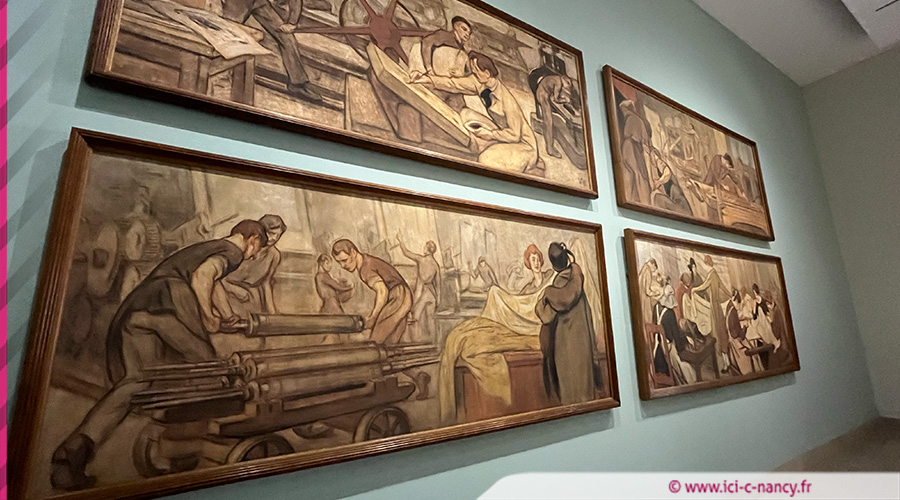 Au cœur de ce parcours de 500 m² au sein du Musée des Beaux Arts, les visiteurs découvrent les grands panneaux de Victor Prouvé, père de Jean Prouvé, seuls vestiges du pavillon détruit après l’exposition. Ces toiles récemment restaurées rendent hommage aux hommes et aux femmes au travail, symboles d’une industrie devenue art. Une présence qui rappelle à quel point l’esthétique et la technique étaient alors indissociables.