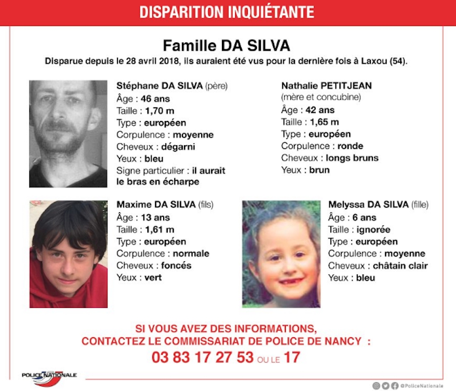 Après une diffusion urgente il y a quelques jours diffusée dans tous les commissariats et gendarmeries de France, la police de Nancy a lancé ce mercredi un avis de recherche sur les réseaux sociaux pour retrouver plusieurs membres de la famille DA SILVA disparue depuis fin avril. Stéphane 46 ans, sa compagne Nathalie 42 ans et leurs enfants Maxime 13 ans et Melyssa 6 ans, domiciliés à Laxou n'ont plus donné signe de vie depuis le 28 avril dernier.
