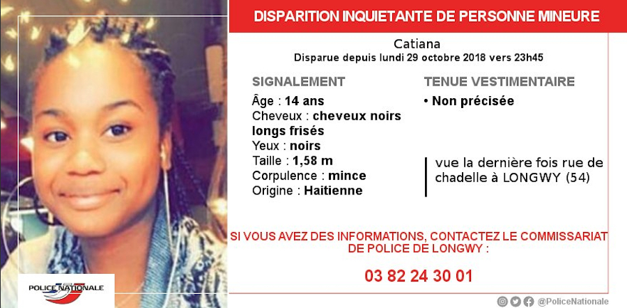 Le commissariat de Longwy lance aujourd’hui un appel pour retrouver la jeune Catiana âgée de 14 ans disparue lundi 29 octobre vers 23 h 45. Selon l’avis de disparition inquiétante diffusé, la jeune fille d’origine haïtienne est de corpulence mince, mesure 1,58 m, a les cheveux noirs longs, frisés et les yeux noirs.