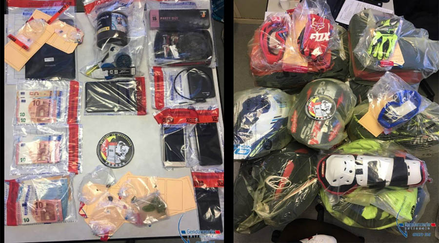 Au cours des perquisitions, des saisies ont été réalisées : « 50 grammes de produits stupéfiants, du matériel de conditionnement, 18 téléphones portables, du matériel informatique, 3 000 euros en numéraire, de nombreux vêtements de marque et des équipements moto », selon un inventaire détaillé de la gendarmerie nationale.