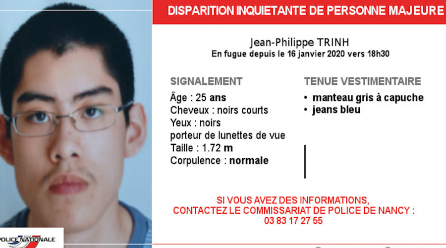 Mais où est Jean-Philippe Trinh ? Ce vendredi 31 janvier, la police reste sans nouvelle de lui. Le jeune homme âgé de 25 ans avait quitté son travail situé au CHRU de Brabois jeudi 16 janvier vers 18h30.