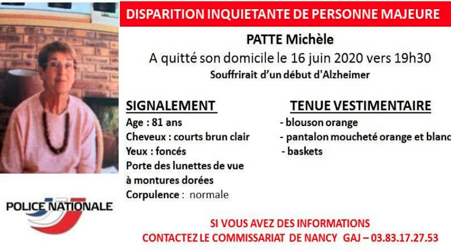 La police lance aujourd'hui un appel à disparition inquiétante de Michèle PATTE, âgée de 81 ans. Disparue hier aux alentours de 19h30, elle a été recherchée à proximité de son domicile et de ses lieux de promenades avec l'usage d'un drone des sapeurs-pompiers et de chiens spécialisés dans les recherches à personnes disparues. Cette dernière pourrait être atteinte "d'un début d'Alzheimer".