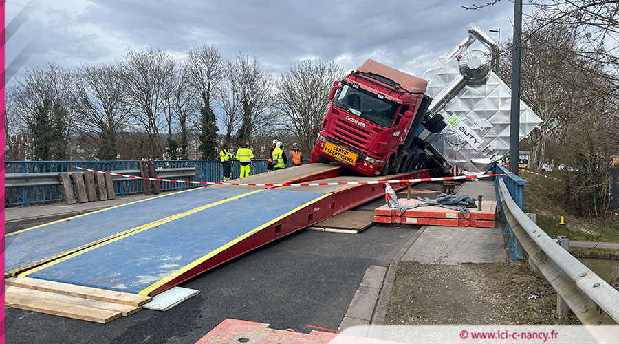 Un spectaculaire incident s'est produit ce lundi 24 février vers 13h30 à Jarville-la-Malgrange, près de Nancy. Un convoi exceptionnel transportant une chaudière de 165 tonnes a basculé sur un tablier provisoire installé sur le pont surplombant le canal de la Marne au Rhin, rue Gabriel Fauré.