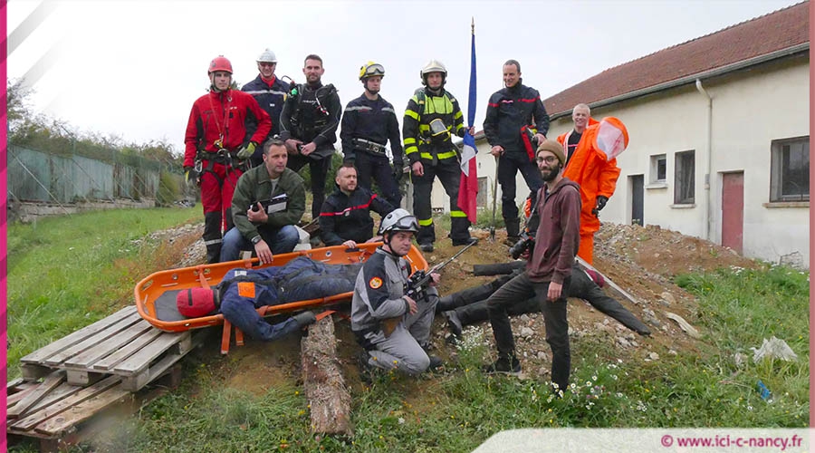 La scène est un peu particulière, elle pourrait certainement surprendre si l’on n’en connaissait pas le contexte. Sur les terrains de la caserne Kleber dans le quartier Brigachtal, deux victimes gisent sur l’herbe. Devant elles, juché sur une butée, un sapeur-pompier brandit un drapeau français en scrutant l’horizon. Il est entouré d’autres soldats du feu endossant quant à eux différents uniformes, scaphandre, équipement de plongée, fusil hypodermique... La voix de Jonathan Magnier, un des sapeurs-pompiers, resté en retrait, résonne en ce milieu de matinée : « On redresse un peu la lance vers le haut... Un peu plus en arrière... On ne sourit pas trop... Le bras plus vers le haut... » Les déclics de l’appareil photo se poursuivent. Mais, à quoi jouent donc les sapeurs-pompiers ?