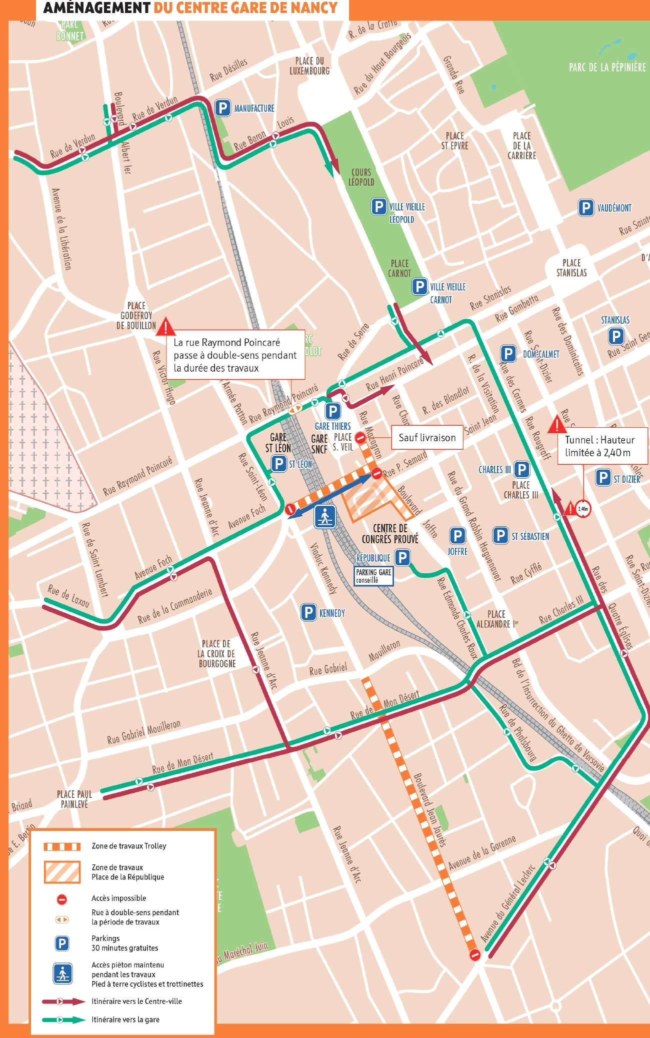 Conséquence pour les conducteurs d'autres parcours devront être pris pour rejoindre le centre-ville ou rejoindre la gare. En arrivant du secteur Nord et nord-ouest par boulevard de Scarpone, Albert Premier ou par Libération, les conducteurs rejoindront le centre-ville par la rue de Verdun et le Cours Léopold. Pour ceux qui partiront de l'Ouest de l'agglomération de Laxou ou Villers-lès-Nancy, les automobilistes seront invités à se diriger vers Mon Désert, le Pont des fusillés et sur Saint-Léon pour rejoindre le secteur gare.