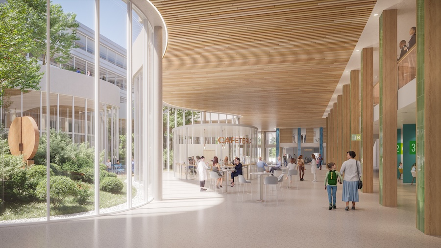 "Pierre angulaire du projet, cette centralité assure pour l’ensemble du site accessibilité, connexions et mutualisation des espaces grâce au grand hall partagé, à la confluence de trois plots", souligne le CHRU.