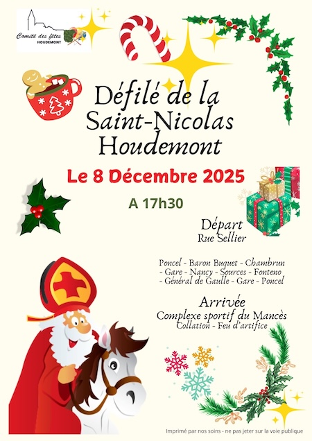 Le lundi 8 décembre 2025, à partir de 17h30, Houdemont célébrera la traditionnelle Saint-Nicolas lors d’un grand défilé organisé par le Comité des Fêtes. Petits et grands sont invités à venir profiter d’un cortège festif, suivi d’une collation conviviale et d’un feu d’artifice qui clôturera la soirée en lumière.