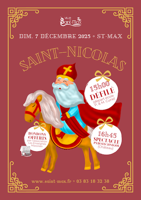 Concours des maisons illuminées du 24 novembre au 16 décembre. Le défilé aura lieu le dimanche 7 décembre 2025 avec un départ à 15h00 à l’école Pierre et Marie Curie. Sur le chemin du défilé, des bonbons seront distribués aux enfants par l’association les Enseignes Maxoises. Un spectacle Pyrotechnique suivra à 16h45 sur l'esplanade du Château. Après le cortège, vous pourrez assister à la cérémonie symbolique de la remise des clés de la Ville, suivie d’un spectacle pyrotechnique.