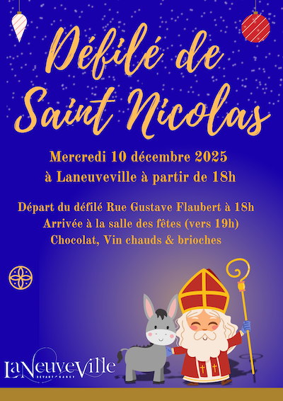 Le mercredi 10 décembre 2025, Laneuveville accueillera le traditionnel défilé de la Saint-Nicolas ! Dès 18h, petits et grands pourront suivre le cortège au départ de la rue Gustave Flaubert, avant de rejoindre, dans la bonne humeur, la salle des fêtes, où l’arrivée est prévue autour de 19h. Pour terminer cette soirée chaleureuse, une dégustation de chocolat chaud, vin chaud et brioches sera offerte aux participants. Un moment convivial et festif à partager en famille !