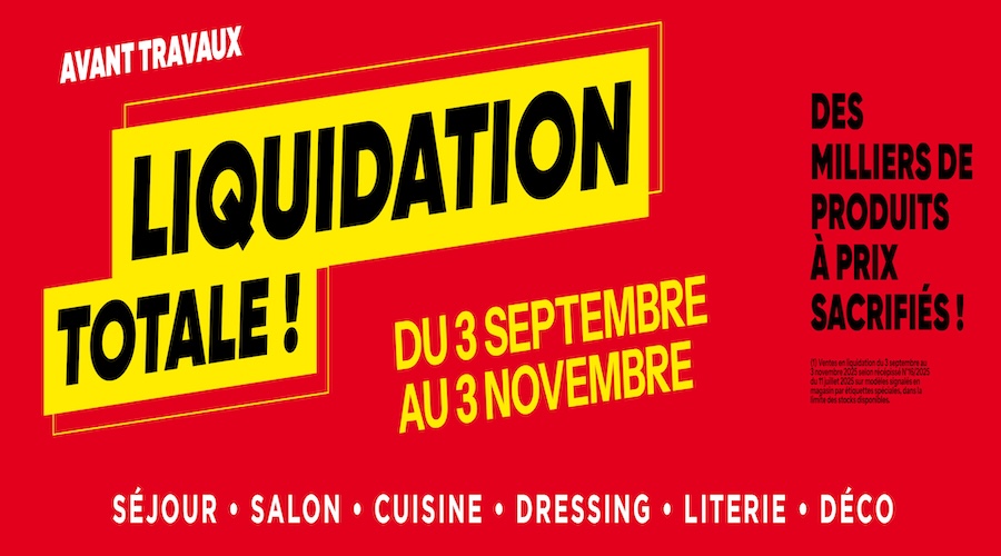 Avant ce grand anniversaire, le magasin lance une liquidation totale avant travaux, du 3 septembre au 2 novembre 2025, avec des remises exceptionnelles de –30 % à –70 % sur tout le magasin : meubles, cuisines, dressings, literie, décoration…