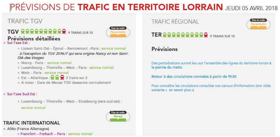 SNCF. Le trafic sera quasi normal sur le réseau ferroviaire ce jeudi 5 avril 2018. Les estimations de trafic en Lorraine.