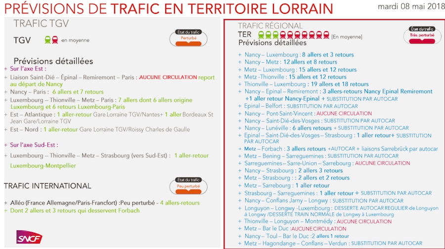 En territoire Lorrain, sont prévus 1 TGV axe Est sur 2 et 3 TER sur 10. Concernant le trafic international ALLEO (France - Allemagne) il sera peu perturbé.