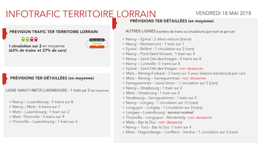 En territoire Lorrain, sont prévus 7 TGV axe Est sur 9 ; 1 TGV Lorraine Sud Est sur 3. Pour les TER en territoire lorrain 1 sur 2 ; sur les trains intersecteurs Est Atlantique et Est Nord 5 trains sur 6. Retrouvez les prévisions en suivant ces liens :