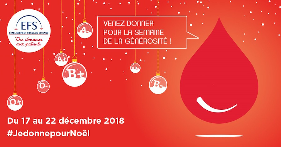 Afin d’allier la générosité de cette période de Noël avec le don de sang, l’EFS Grand Est va proposer du 17 au 22 décembre 2018 la « semaine de la générosité », un évènement pour inviter les donneurs à venir dans les sites de prélèvement avant les fêtes. Tout au long de cette période sur tous les sites de la région les donneurs retrouveront une atmosphère festive : décoration, musique, une collation spéciale Noël et un mur photos aux couleurs de Noël, il sera même possible de repartir avec une photo polaroid. Vendredi 21 décembre pour la journée mondiale du pull moche de Noël, les donneurs sont invités à se rendre à l'EFS avec leur pull le plus moche.