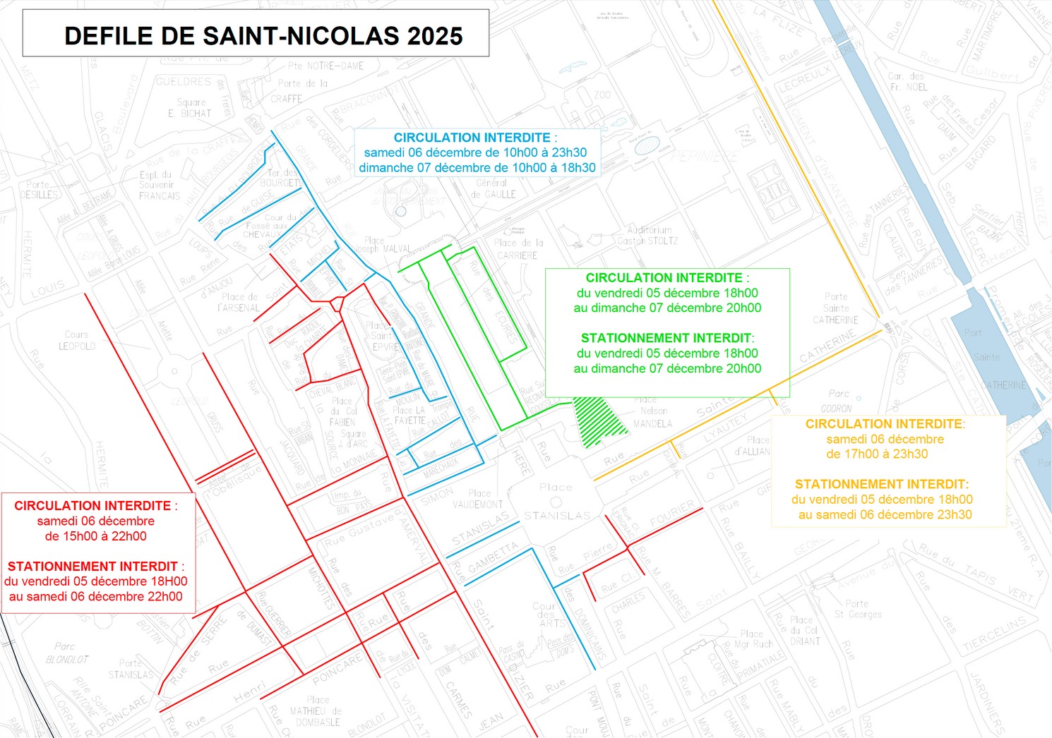Cartographie de circulation et du stationnement samedi 6 décembre 2025 à Nancy - source Ville de Nancy