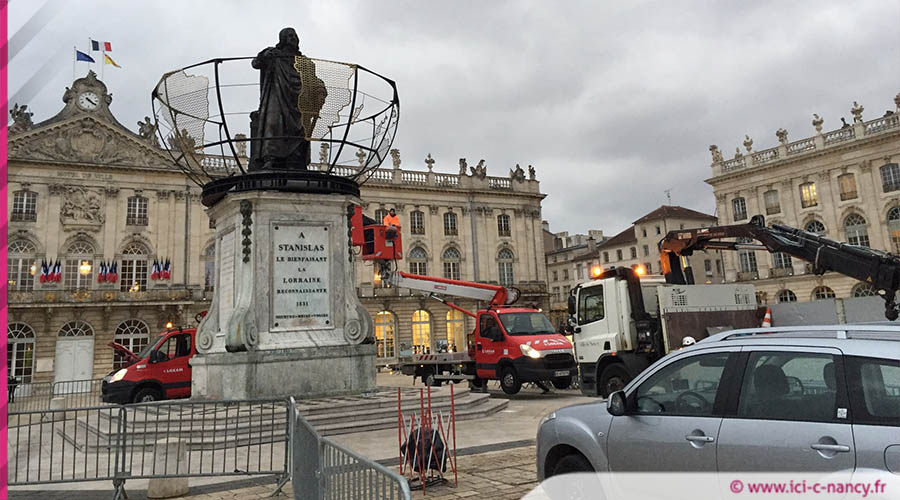 Mais que se trame-t-il sur la Place Stanislas et pour quelle raison une grue s'active-t-elle autour du Roi de Pologne, Duc de Lorraine ? Il s'agit en fait de la mise en place d'un nouvel élément de décor pour les fêtes de Saint Nicolas. La structure, un globe constitué de barres d'acier de 3 mm d'épaisseur cintrées et de tôles d'acier ajourées découpées au laser, reprenant le motif des fleurs de cerisier a commencé à être assemblé puis monté sur la statue par les équipes de la Ville de Nancy ce lundi 19 novembre.