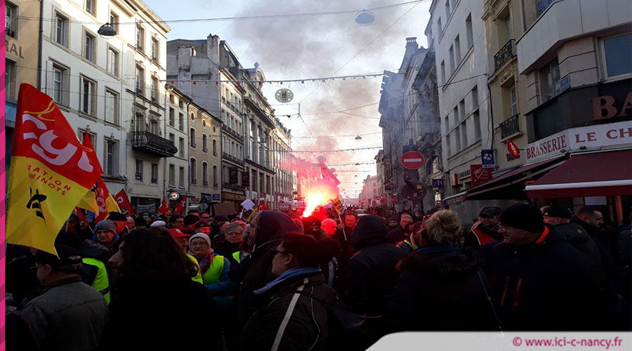 À l'appel de l'intersyndicale (CGT, FO, Solidaires, FSU et CFE-CGC), 2100 participants se sont déplacés à Nancy selon les chiffres de la police (6000 selon les chiffres du syndicat FO), sans incident majeur.