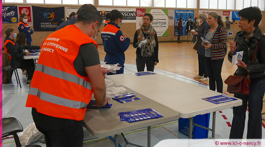 Au gymnase André Martiny sur les Rives de Meurthe, l’un des cinq centres de distribution habilité par la Ville de Nancy, les premiers Nancéiens sont venus rechercher ce matin un bien aussi rare que précieux inscrit dans la lutte de la propagation contre la pandémie : des masques de protection. Pour obtenir ces masques, chacun s'est prêté au préalable à une prise de température frontale, un lavage des mains et d'une vérification d’identité.