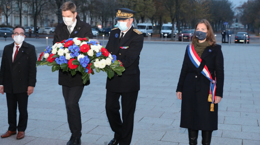 « Commémoration de l’Armistice du #11Novembre 1918 au Mémorial Desilles pour honorer la mémoire de toutes les victimes de la Première Guerre mondiale qui a ensanglanté l’Europe. L’occasion également de réaffirmer notre attachement indéfectible à la paix », rappelle Mathieu Klein sur Twitter.