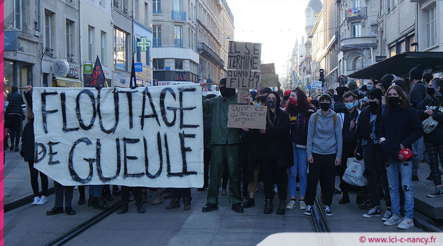 Présenté comme un rassemblement, certains manifestants ont improvisé un cortège pour quitter la place Maginot vers 15 h 30 en direction de la rue Saint-Jean pour converger rue des Dominicains où se trouvaient les forces de sécurité qui interdisaient l'accès à la Place Stanislas. Dans le cortège plusieurs pancartes ont été brandies comme « floutage de gueule », « Police partout, justice nulle part » « baissez vos armes, nous baisserons nos téléphones » le tout accompagné par divers chants anti-police.