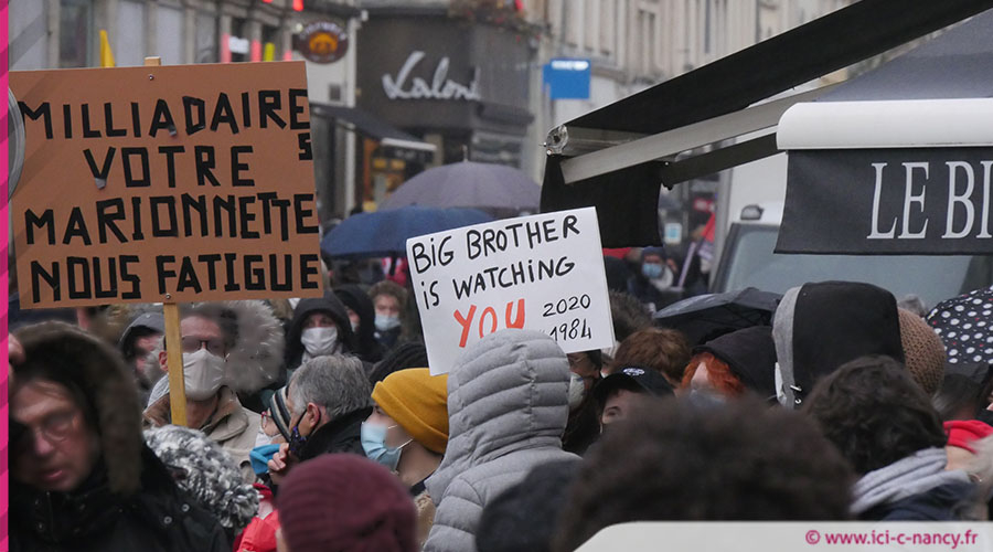 Ils dénonçaient à Nancy comme dans d'autres villes de France la proposition de loi « sécurité globale » qui a été votée le 24 novembre en première lecture par les députés à l’Assemblée nationale et qui sera examinée par le Sénat au début de l’année 2021. À Nancy, au plus fort du rassemblement, ils étaient près de 550 manifestants (chiffres police) à défiler à l’appel d’une quinzaine de collectifs, syndicats et mouvements politiques dont SUD-Solidaires 54, Union Locale CGT de Nancy, FSU 54, SAF Nancy, UNEF Lorraine, Ecologie Les Verts Nancy, La France Insoumise 54, Parti de Gauche 54, NPA 54 sud,...