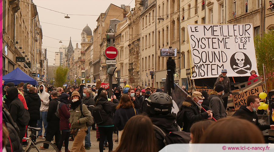 Ils étaient plusieurs centaines de manifestants venus marteler leur opposition à la politique du gouvernement, « le système mis en place », « les lois liberticides » et clamer leur volonté pour davantage de justice sociale et fiscale. Le cortège s’est formé sur la place de la République aux alentours de 13 h 30 avant de s’élancer dans les rues nancéiennes. Pour accompagner le cortège des affiches : « Macron Picsou », « R.I.C » , « Le meilleur système c'est le sound system » des jets de pétards et des slogans anti-police prononcés à de nombreuses reprises « Acab » et « Police partout, justice nulle part » .