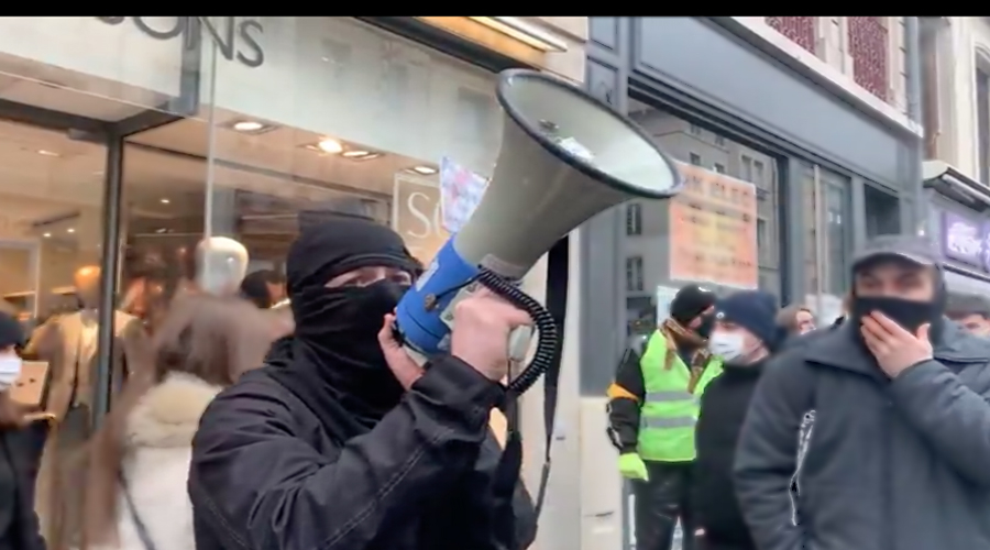 Dans une des artères principales du commerce de centre-ville, la rue Saint-Jean, le porte parole du Bloc Lorrain, organisateur de la manifestation, masqué et coiffé d'une capuche noire, s'adresse à l'aide d'un porte-voix, au préfet de Meurthe-et-Moselle et au maire de Nancy pour railler le désintérêt des services de l'État à leur cause.