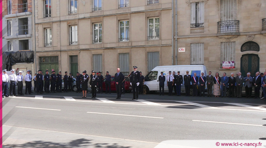 Sous un soleil radieux, une minute de silence a été observée puis la Marseillaise a retenti en présence d'un aéropage de personnalités, de nombreux représentants de l'État dont François Pérain, procureur de la République de Nancy et d'élus de tous bords ainsi que d’autorités civiles. Une gerbe de fleurs a été déposée devant le commissariat en mémoire des policiers morts en service.