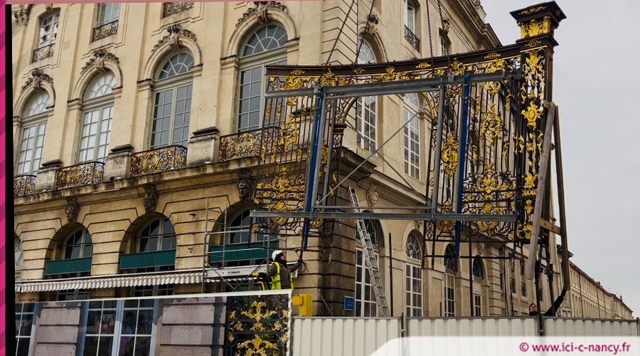 Après avoir quitté leur socle en pierre, ces grilles seront conservées en sécurité et le temps des travaux pour retrouver la place Stanislas à l'horizon 2026. En attendant, une palissade de sécurité de 36m60 x 2m50 a été installée devant l'Hôtel de la Reine par la Ville de Nancy ainsi qu'un trompe l'œil du bâtiment à l'échelle 1/1 pour embellir l'espace.