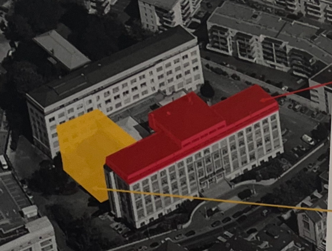 En image (à droite). En rouge, démolition prévue des surélévations R+4 et R+5 ajoutés dans les années 70. En jaune, l'emprise pour la construction neuve pour la black box de 300 places. / source Ville de Nancy