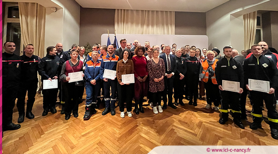 Enfin, la mention honorable pour acte de courage et de dévouement a été décernée à plusieurs bénévoles et responsables des associations agréées de sécurité civile du département : Monsieur Emerik BEGIN, trésorier territorial de la Croix-Rouge de Meurthe-et-Moselle et directeur des opérations ; Monsieur Franck BEUCLAIR, bénévole de l’unité départementale des premiers secours et responsable du parc véhicule ; Messieurs Lucas BERNEL et Nicolas BERTEAUX, présidents d’antennes de la Croix-Blanche de Meurthe-et-Moselle ; Monsieur Lucas BONTEMPS et Monsieur Bastien RUY, bénévoles de la Fédération Française de Sauvetage et de Secourisme ; Madame Loriane CHRETIEN, présidente de l’unité locale de la Croix-Rouge de Nancy ; Monsieur Charlie HOUBAUT-VIGNERON, responsable du matériel opérationnel et de la logistique ; Monsieur Alexandre MAYEUX, directeur général de la Protection civile de Meurthe-et-Moselle et coordinateur interassociatif ; et Monsieur Jérémy MOREAU, conducteur VPSP à la Protection civile.